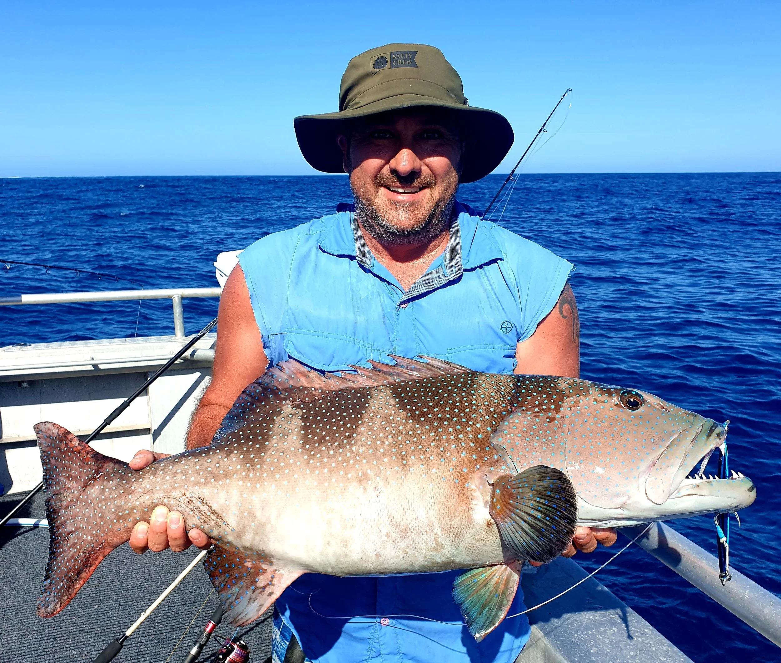 The fish species you encounter include coral trout, rankin cod, spangled emperor, and bluebone, while the surrounding deeper waters hold Spanish mackerel, longtail tuna, sailfish, and even marlin.